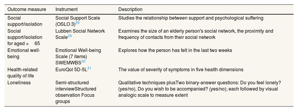 Loneliness  Semi-structured interviewStructured observation Focus groups  Qualitative techniques plusTwo binary-answer questions: Do you feel lonely? (yes/no), Do you wish to be accompanied? (yes/no); each followed by visual analogic scale to measure extent