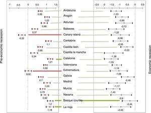 The linear regression analyses for each autonomous region show a general annual increase in fertility rates during the pre-recession period, except for the Canary Islands, which has experienced declining fertility since 1998, and Extremadura. Interestingly, both of these regions are in the highest quartile of unemployment. The highest annual increase in fertility rates during the pre-recession period were observed in the Basque country, La Rioja and Catalonia (Fig. 3). In contrast, we observe a decrease in the annual fertility rate in all regions during the recession, although this trend was not statistically significant for the Basque Country, a region that has been growing more than the rest (Fig. 3).