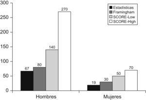 Las tasas anuales de mortalidad cardiovascular por 100.000 habitantes en Alemania, de 79,8 en los hombres y 24,0 en las mujeres, eran aproximadamente un 20% mayores que en Canarias, donde alcanzaron el 67,4 y el 19,3, respectivamente. En la tabla 2 se muestra la estimación del riesgo promedio de evento fatal en 10 años según las tres funciones calibradas para Canarias y Alemania. Mientras en Alemania las estimaciones de la función de Framingham se situaron de forma intermedia entre ambas SCORE, en Canarias las estimaciones fueron más altas en ambos sexos con las funciones SCORE, sobre todo en los hombres: el riesgo casi se duplicó con SCORE-Low y se triplicó con SCORE-High en relación al estimado por Framingham.