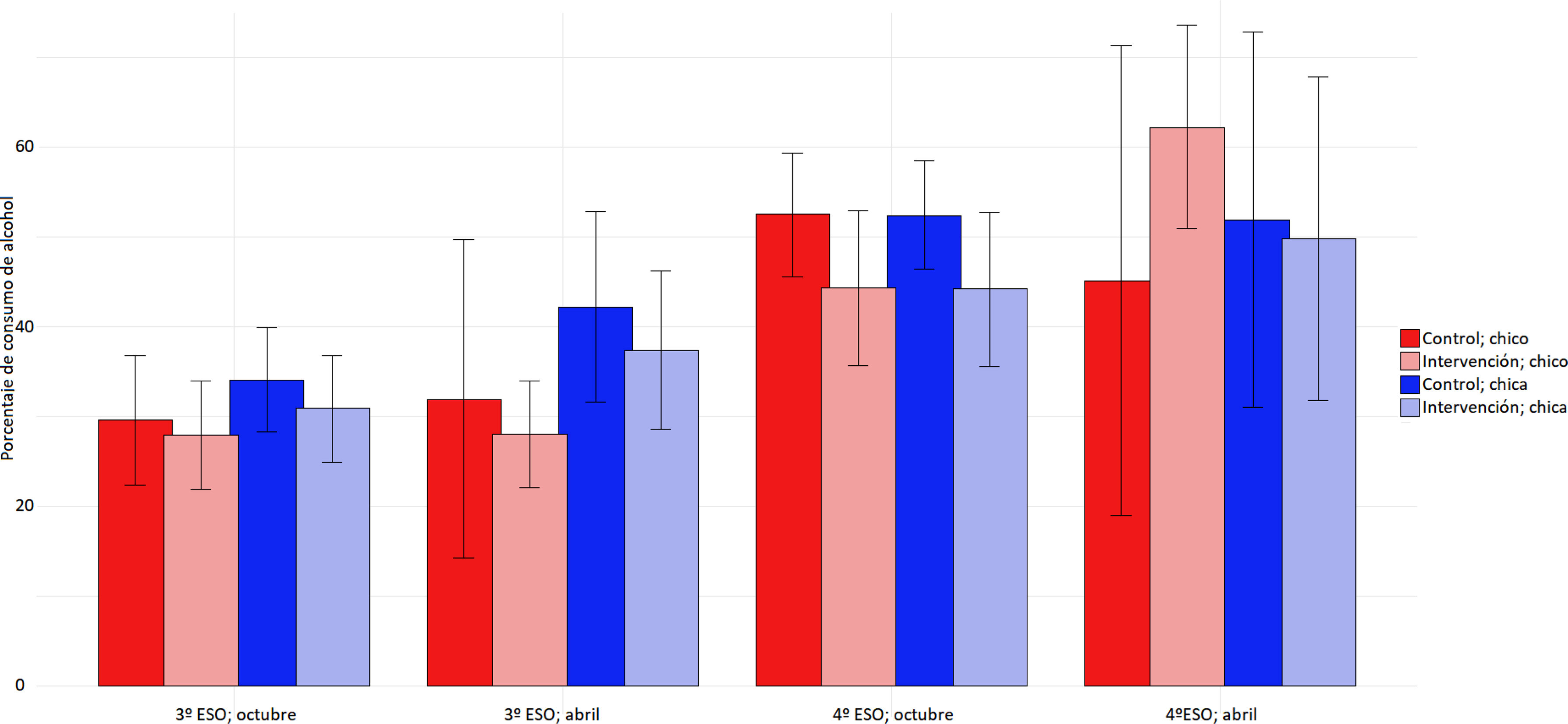En la figura 1 puede verse que las chicas de ambos grupos muestran mayores prevalencias de consumo de alcohol alguna vez en la vida en 3.° de ESO, con una mayor evolución del consumo durante el desarrollo del curso. Sin embargo, en 4.° de ESO esta tendencia se invierte. Con excepción de los chicos en abril en 4.° de ESO, el GI presenta menores niveles de consumo que el GC en ambos sexos.