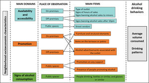 This work is part of the Heart Healthy Hoods Project (https://hhhproject.eu/) studying the associations between the social and physical features of the urban environment and cardiovascular health in the municipality of Madrid,10 the most populated city in Spain, with approximately 3.2 million residents.11 Spain is a Southern European Country, with a yearly average consumption of 9.5 l of pure alcohol per capita, traditionally part of the wine growing culture, and a major tourist destination.12