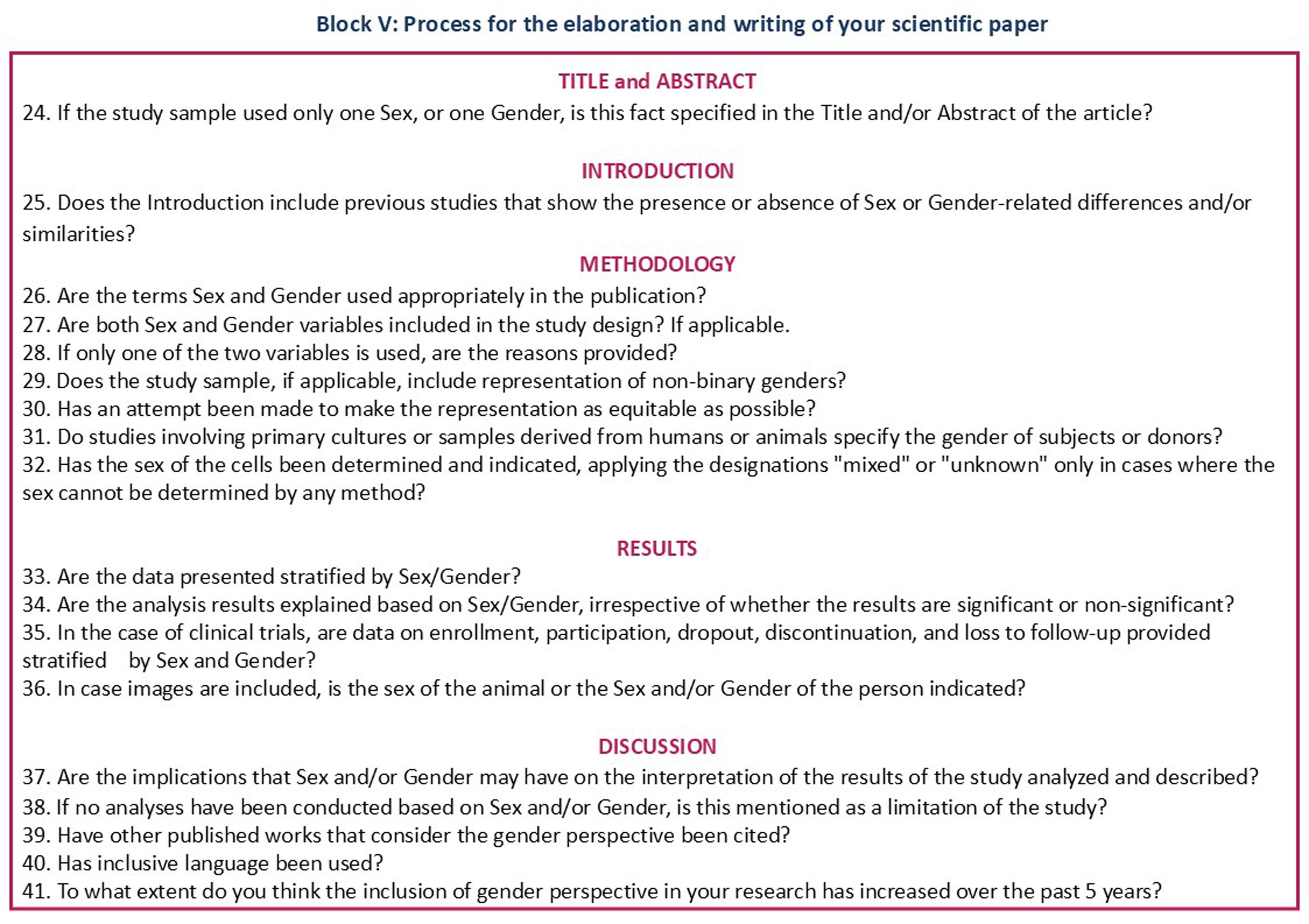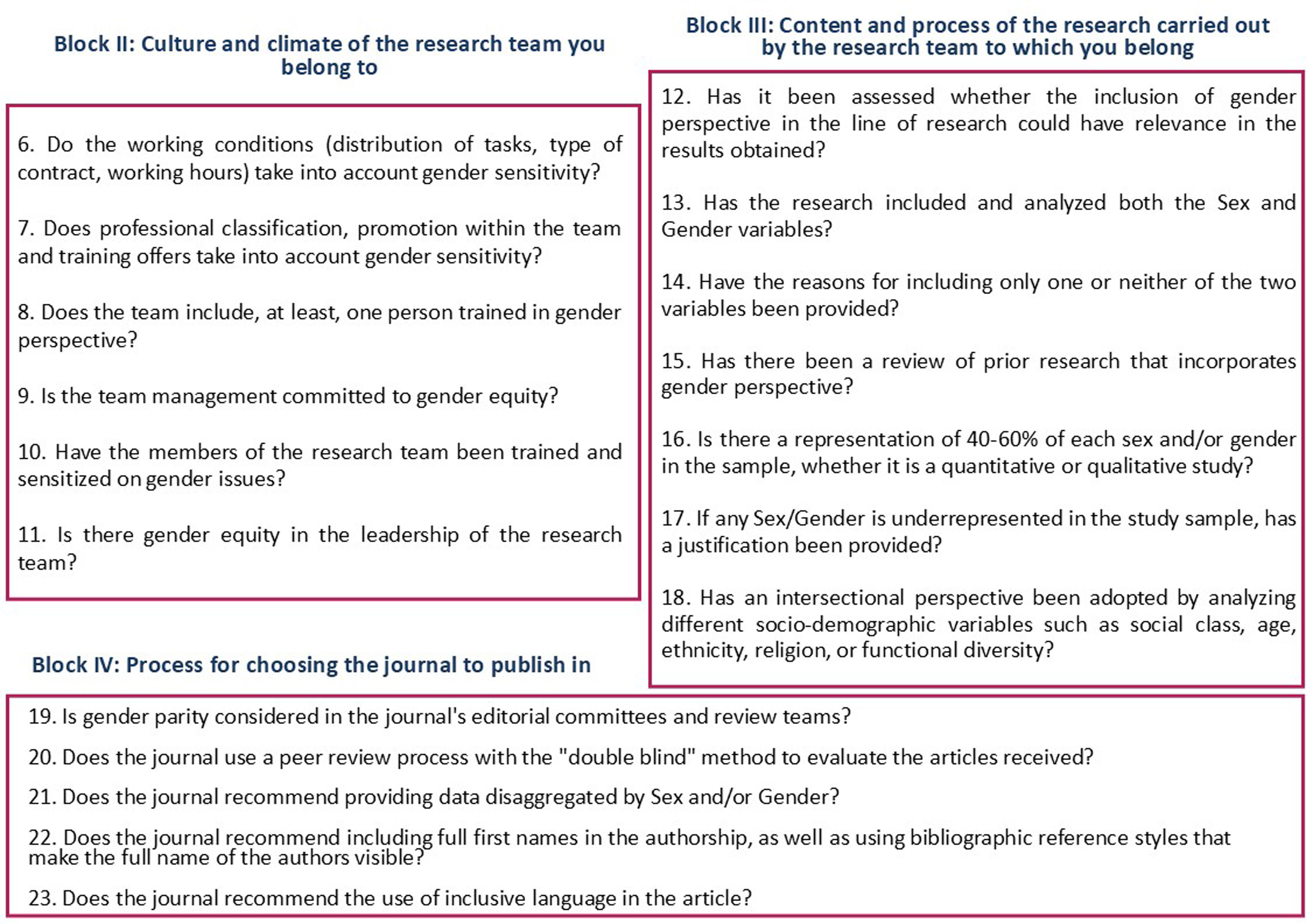 The previous SAGER,1 GATHER10 and Uppsala Universitet22 checklists include 12, 16 and 13 items, respectively, on the research data and information to be collected, detailed and reported to ensure transparent health science accessible to all populations, focusing on the description of objectives and funding, data acquisition and analysis, results and discussion. Likewise, the Gendered Innovations Division of Stanford University23 provides a checklist to ensure that gender differences are recognised and addressed in research design in various scientific disciplines, which, in the field of health, specifies the choice and use of the measurement tool, the type of study, the protocol, analysis and dissemination, and specifies the application of the SAGER guidelines.1 However, in none of the cases are indicated aspects related to the composition of research teams or journal committees.