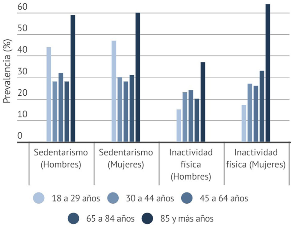 ResultsThe overall prevalence of sedentarism was around 32% in sexes, reaching 60% in the age group older than 85 years and 45% in young people aged 18 to 29 years. The prevalence of physical inactivity was 22% in men (15% in the youngest and 37% in the oldest) and 29.5% in women (17% in the youngest and 64% in the oldest). Differences were found in the prevalences of sedentarism and physical inactivity according to socioeconomic level, with people of higher social class being more sedentary, and people with lower educational level being more inactive.