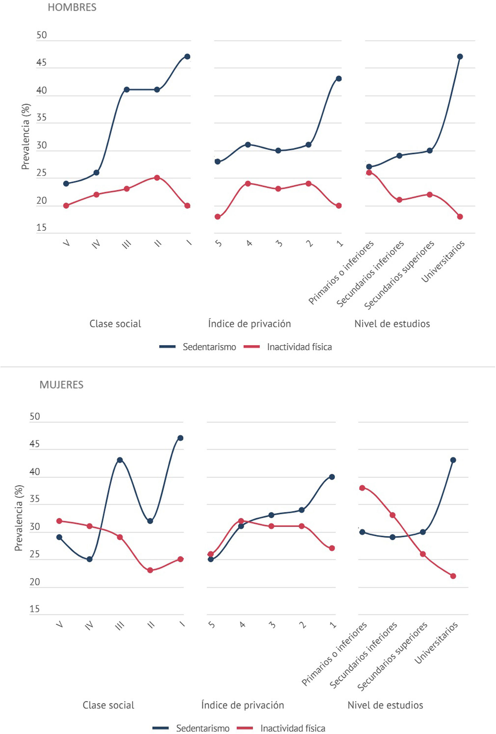 En relación con la clase social, en la población adulta del País Vasco, el comportamiento sedentario de riesgo en hombres y mujeres fue mayor en los niveles socioeconómicos más altos, tanto según la clase social como según el índice de privación del lugar de residencia o el nivel educativo.