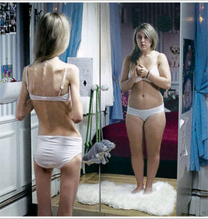 Bajo una errónea y a la vez imperativa idea de salud física y mental3, el discurso publicitario centrado en los productos hipocalóricos y adelgazantes utiliza impunemente desde hace años situaciones claramente paralelas a las que se describen en el diagnóstico de los trastornos del comportamiento alimentario: una percepción corporal distorsionada, el aumento de peso como amenaza recurrente, la delgadez como sinónimo de felicidad, el deporte transformado en purificadora necesidad, el verbo «cuidar» como eufemismo de controlar –de castigar, incluso–, el uso de laxantes como parte de la rutina cotidiana… Y en el espejo, nuevamente ese espejismo, como una vara de medir los miedos propios y la aceptación ajena. ¿Existen acaso espejos totalmente privados? ¿O son quizá todos espejos colectivos? Es difícil protegerse, aislarse por completo… Lo colectivo aparece, se inmiscuye, se cuela siempre en el espejo de cada alcoba.