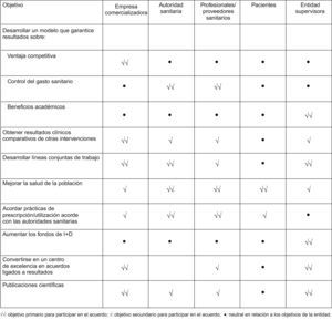 Los acuerdos de riesgo compartido presentan posibles ventajas para los agentes participantes. En este sentido, todos los agentes implicados pueden ganar con la aplicación de este tipo de acuerdos en la introducción de una tecnología sanitaria concreta (estrategia tipo win-win). No obstante, resulta claro que los objetivos de los distintos actores no siempre coinciden (tabla 1). Por tanto, un acuerdo de riesgo compartido sólo resultará atractivo si es capaz de alinear los incentivos de los diferentes agentes implicados en la búsqueda de objetivos comunes. Para ello resultará clave considerar que este tipo de acuerdos no son aplicables en cualquier marco, y que requieren contemplar una serie de condicionantes.