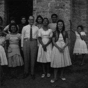 Héctor Abad Gómez con un grupo de promotoras rurales de salud en Santo Domingo Antioquia. Foto alrededor de 1964. Archivo familiar-Corporación Héctor Abad Gómez.