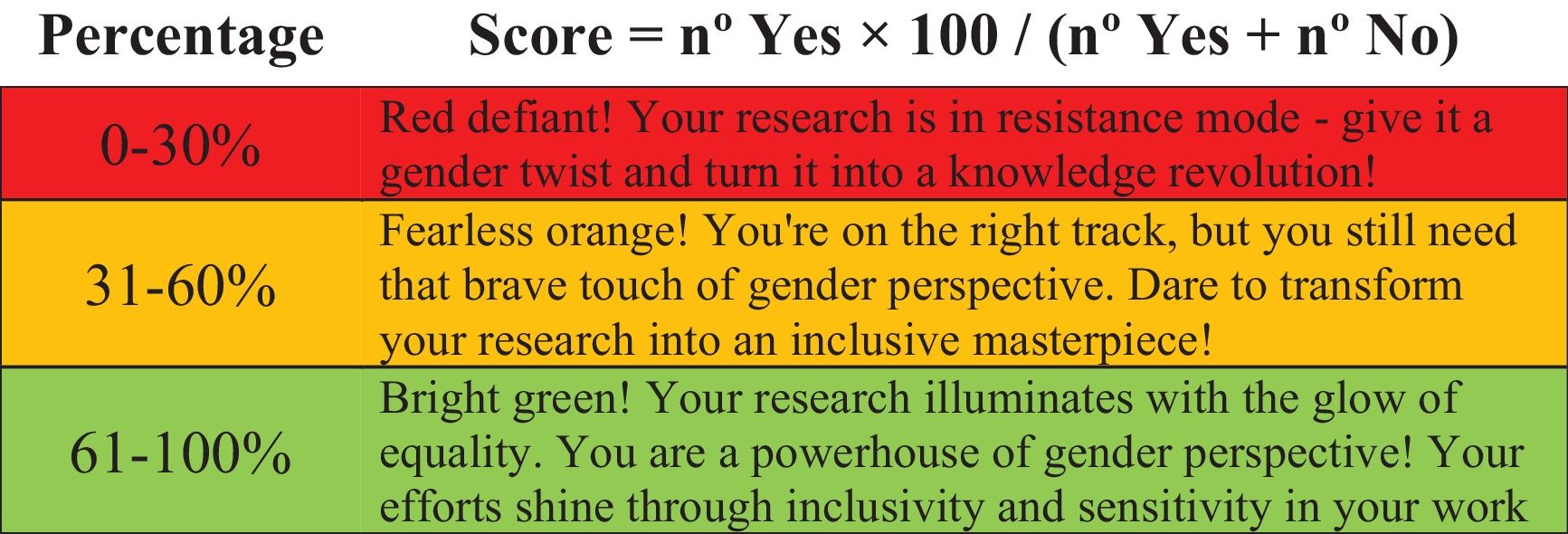 The developed checklist offers several key advantages: 1) it provides a concise summary of concepts related to the gender perspective as a tool to help before answering the questionnaire; 2) promotes scientific excellence by supporting the development of research that supports comprehensive, fair, transparent and truthful results; 3) fosters the formation of stable, diverse, and talented research teams by supporting the inclusion of people with diverse and atypical careers; 4) enables innovation by enhancing the creation of new approaches and better solutions to meet society's needs, and openness to new ideas; 5) advances the recognition and inclusion of gender diversity and the defence of human rights, thus contributing to better, more personalised and tailored health care, which also generates greater social cohesion; 6) raises awareness of gender mainstreaming across various fields, including basic, preclinical and clinical research translational studies and epidemiology and public health, while encouraging reflection on the diversity of patients and challenging stereotypes, taboos and fears in health research participation; 7) is simple and cost-effective requiring no additional resources, prior user training or the hiring of teams of staff specialised in gender or more complex technologies; 8) delivers immediate results through an automatic, objective global score indicating the level of inclusiveness and sensitivity to the gender perspective, along with feedback on a three-level green-orange-red scale; 9) it is multi-level as it can be used at any stage of a biomedical study, even in ongoing studies or those at an advanced stage of development, as it allows each block to be evaluated independently and accurately; and 10) provides a quality certificate that validates and supports biomedical science, research groups and institutions in their commitment to more inclusive and sustainable progress in line with global challenges and the 2030 Agenda,35 the WHO,10 and the NIH,21 and other previously published guidelines.14