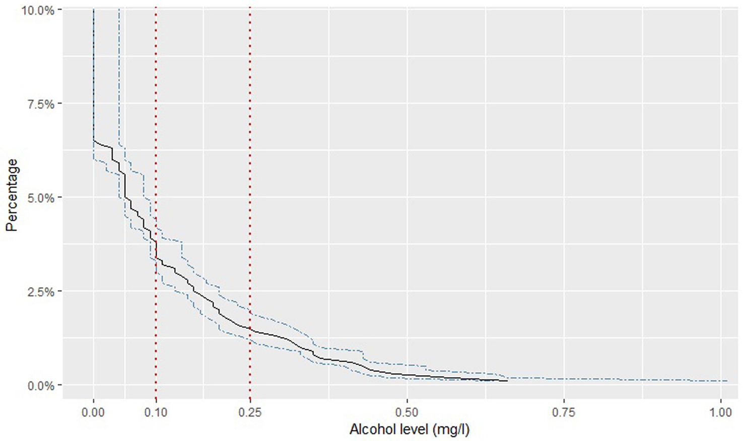 ResultsThe percentage of drivers with a BrAC>0.10mg/L was 3.8% (95%CI: 3.2-4.4), more than twice the percentage with a BrAC>0.25mg/L (1.6%, 95%CI: 1.2-2.0). Males (4.0%, 95%CI: 3.3-4.6 vs. 1.6%, 95%CI: 1.2-2.0) and those aged over 65 years (4.3%, 95%CI: 2.2-6.4. vs. 0.8%, 95%CI: 0.2-1.5) are particularly impacted by the alcohol limit reduction.
