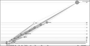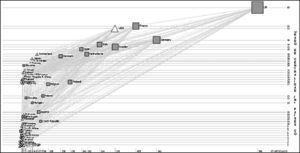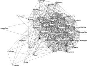 A la elaboración de mapas a partir de información bibliométrica también se la conoce con el nombre de «cienciografía», que se refiere al hecho de cartografiar la ciencia34. Los cienciogramas ayudan a diseñar y completar la imagen mental que se tiene sobre algún aspecto científico, son informativos y mediante ellos es fácil determinar los núcleos científicos más importantes, sus relaciones y los intermediarios de éstos34. Con ellos ponemos de relieve en este trabajo el entramado de colaboración internacional en el tema del tabaquismo.