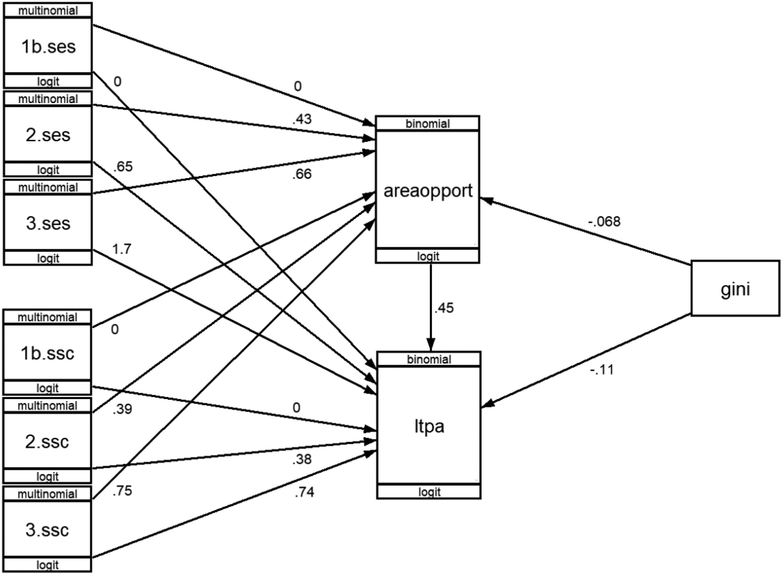 ResultsPerformance of LTPA according to SES, SSC, AREAOPPORT and Gini indexIn 2022, 76.5% of EU citizens carried out some type of LTPA. Nevertheless, this practice is different depending on the SES, SSC, AREAOPPORT and the distribution of wealth in the country where they live (Gini). Figure 1 shows the b values of the regression carried out using the GSEM. Table 1 shows the OR values that are the exponents of b. The variable that most influences is SES, so that for every 100 people with low SES (see OR value low=1) who practice LTPA we have 192 (see OR value 1.92) of middle SES and 527 of upper SES (see OR value 5.27). It is found that SSC has also an influence after controlling the effect of the other variables, so that among people of the same SES, if people consider themselves to be of a different class, this subjective assessment is also influencing the practice of LTPA. For every 100 people considered to be from working or lower-middle SSC who practice LTPA, we have 146 who are considered middle SSC and 210 who are considered upper or middle-higher SSC.