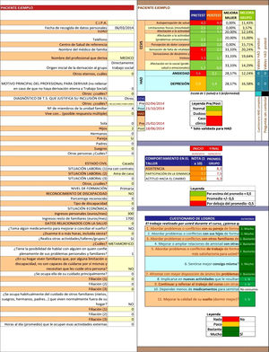 Para la gestión del proceso evaluativo se ha creado una hoja de cálculo de Microsoft Excel 2007 que registra los datos individuales de cada participante y, de forma automática, procesa y ofrece resultados individuales y grupales (fig. 1). También incorpora los modelos de los cuestionarios preparados para imprimir y un modelo de informe individual de resultados para su devolución a los/las profesionales que derivan mujeres a los grupos. Se garantiza la seguridad en el tratamiento y el almacenamiento de los datos mediante cifrado con clave secreta como técnica de pseudonimización4.