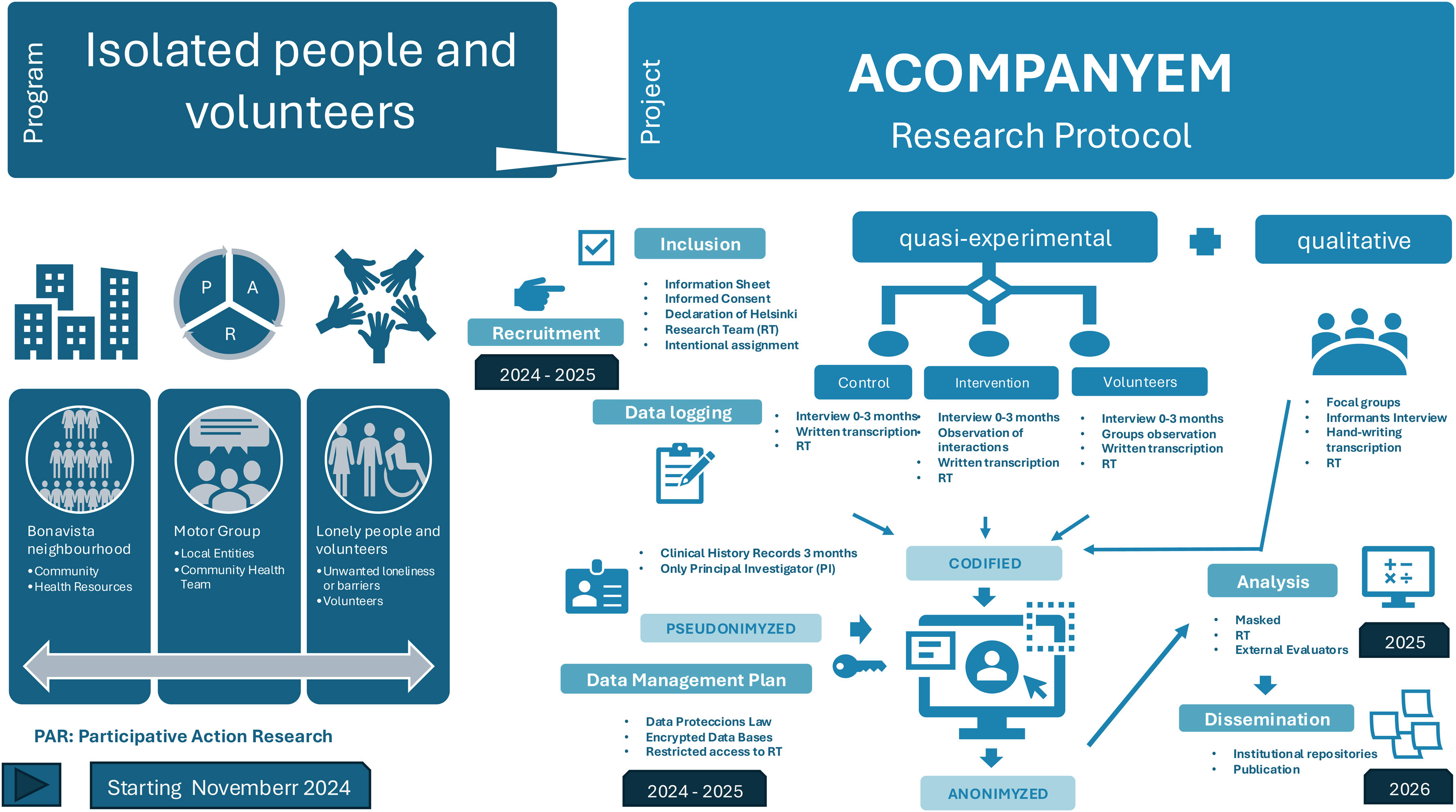 Earlier studies found, paradoxically, a worsening of loneliness in participants after interventions, due to finishing the interaction with the researchers or volunteers. To avoid this effect, we frame the study within a broader community health program that looks to increase health equity; hence, our intervention is not planned to be punctual in time, but we intend to continue and reformulate it in each cycle of participatory action research.