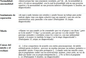 A partir de la información aportada apareció una categoría emergente, que expone la vivencia de separación de dos colectivos: personas diagnosticadas y personas que no lo están. Se ha llamado a esta categoría «los otros», porque así es como ve un colectivo al otro. Entre ambos se establecen roles que son percibidos como un obstáculo para el desarrollo satisfactorio de las personas. La jerarquía de normalidad sobre anormalidad coloca a las personas diagnosticadas (no normales, pacientes de por vida) en una posición de inferioridad y hace que se les excluya de la vida social; las personas no diagnosticadas (normales) muchas veces tienen miedo a las que no entran en esa categoría. Se rechaza a las personas diagnosticadas, cuyo comportamiento muchas veces es diferente a la norma social, para protegerse uno/a mismo/a de no ser aceptado/a socialmente, además de por los conocidos mensajes repetitivos en medios de información, cine y teatro sobre la supuesta agresividad de las personas diagnosticadas (fig. 1 del Apéndice online).