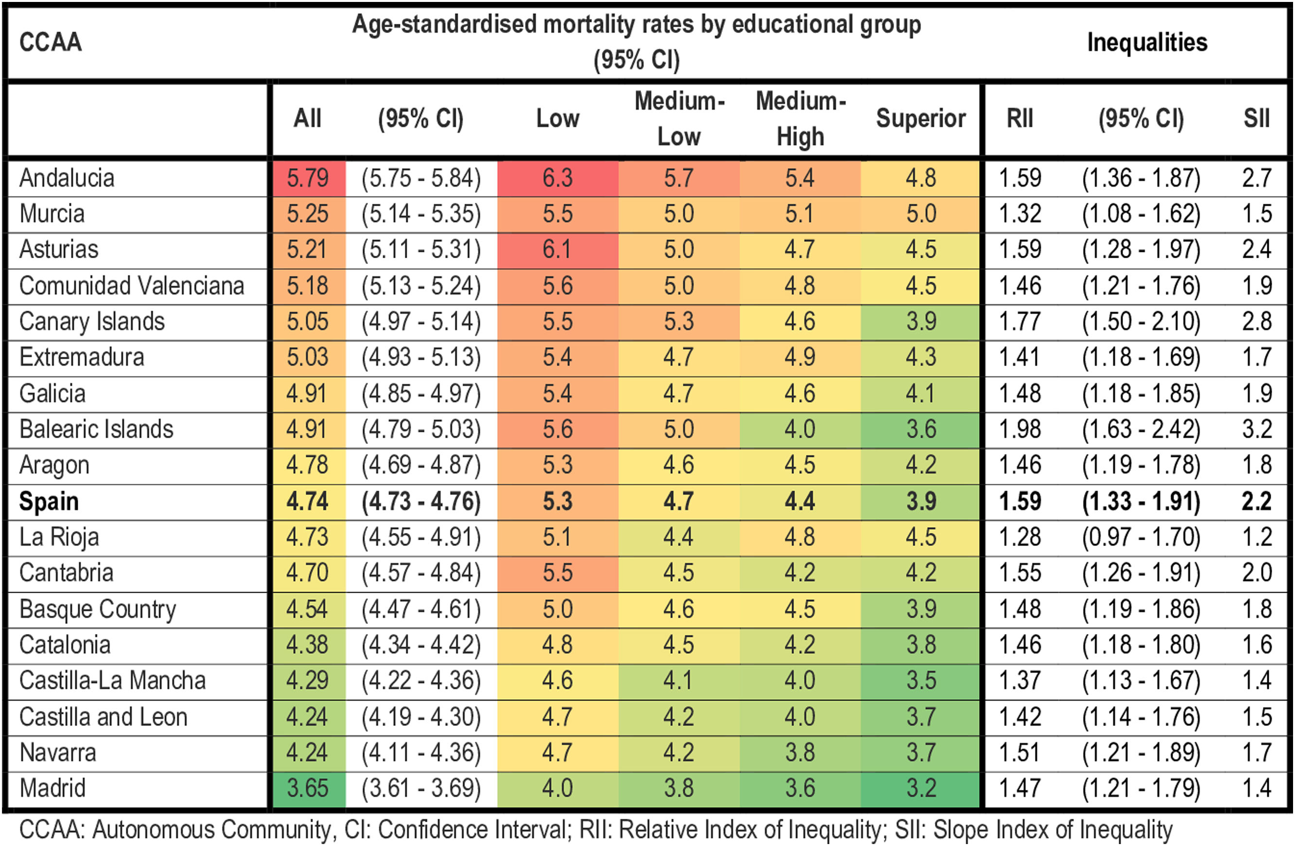 ResultsFor the whole Spain, RII was 1.79 (IC95%: 1.42-2.26) for women and 1.59 (IC95%: 1.33-1.91) for men, with differences across regions. The greatest inequalities were found in the Balearic and Canary Islands, and the lowest in La Rioja.