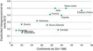La relación entre la desigualdad medida por el coeficiente de Gini y la relación entre la renta de los hijos y la renta de los progenitores se conoce con el nombre de «curva del Gran Gatsby». El grado de movilidad intergeneracional en España es intermedio entre el de Italia y el de Estados Unidos.