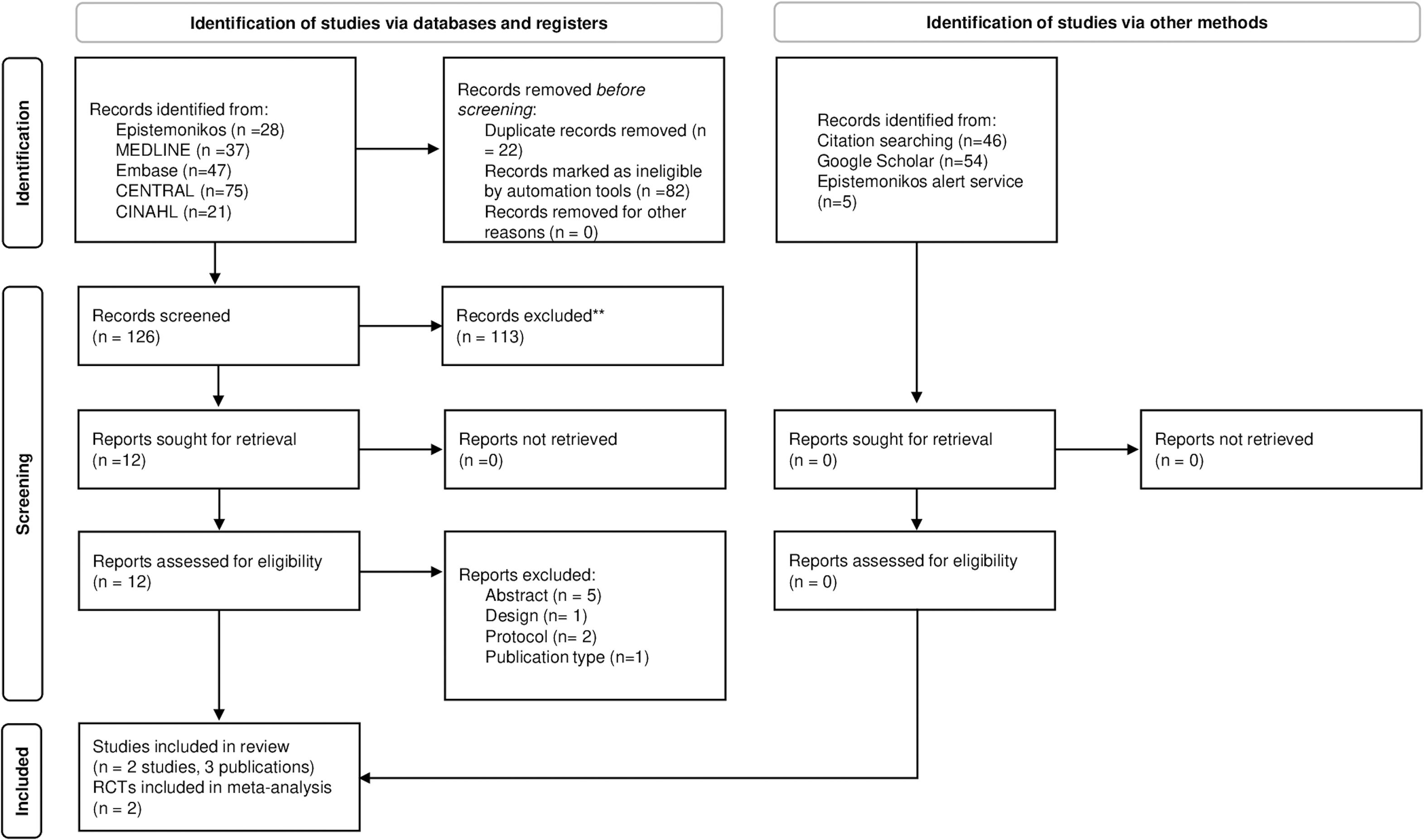 The systematic review searches and subsequent identification of their included randomized controlled trials or non-randomized comparative studies was conducted using technological enablers from the Epistemonikos database, in April 2023. The results were automatically incorporated into the Epistemonikos L·OVE platform,20 where subsequent selection was conducted. An alert service for randomized controlled trials and non-randomized comparative studies was also created, which remained active until May 31, 2024.