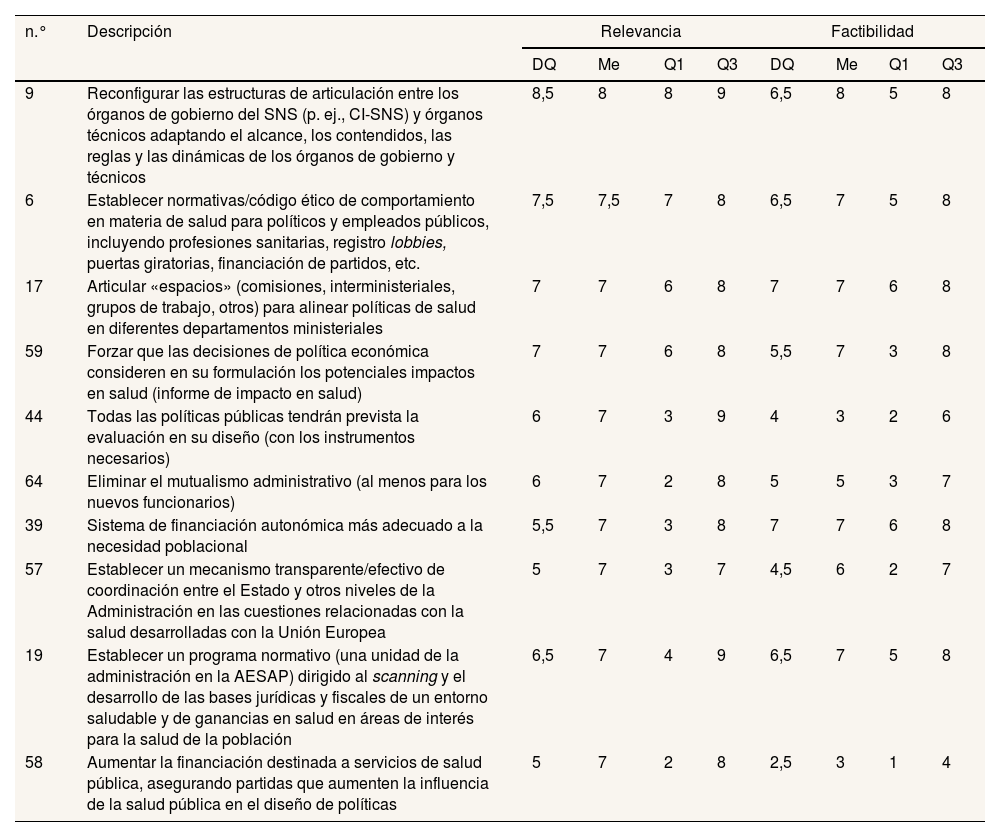 Tabla 3. Propuestas en el bloque de gobernanza y financiación del Sistema Nacional de Salud ordenadas por puntuación (desviación cuartil) de relevancia