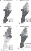 La figura 1 muestra la distribución espacial de las variables de interés. Se observa un patrón espacial similar en la distribución del riesgo de mala salud de hombres y de mujeres. Llama la atención la semejanza en el patrón espacial del porcentaje de pobreza y de la prevalencia de mala salud, según el cual las localidades con peor salud son las más pobres. Un patrón inverso se observa con la distribución del coeficiente de GINI, pues las localidades con menor riesgo de mala salud son las que presentan los mayores niveles de desigualdad de ingresos.